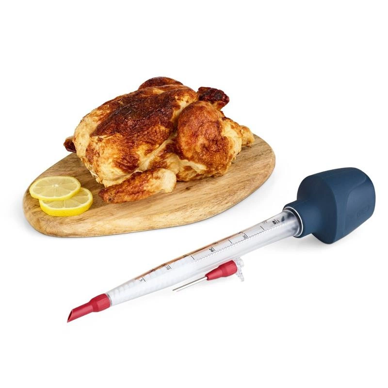Duża, miękka gruszka łatwo napełni zbiornik ze skalą w mililitrach, a nylonowa czerwona końcówka ułatwia nabieranie tłuszczu z naczynia i polewanie nim mięsa. Druga końcówka - igła ze stali nierdzewnej służy do wstrzykiwania marynaty w mięso.
