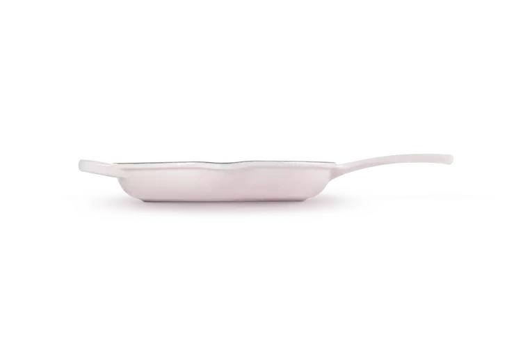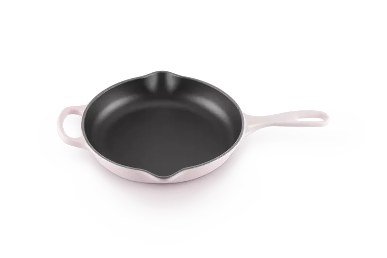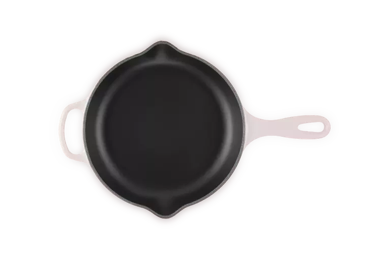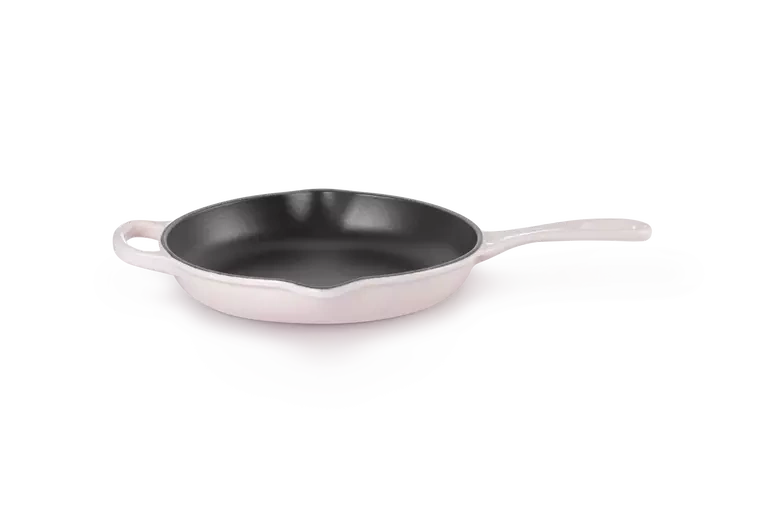 Żeliwna patelnia Signature Le Creuset 23 cm emaliowana kolor shell pink do smażenia i serwowania. Wyposażona w uchwyt żeliwny zapewniający bezpieczne przenoszenie, jednocześnie można naczynie używać do zapiekania w piekarniku. Dwie wylewki zapewniają wygodne wylewanie płynów i sosów.
