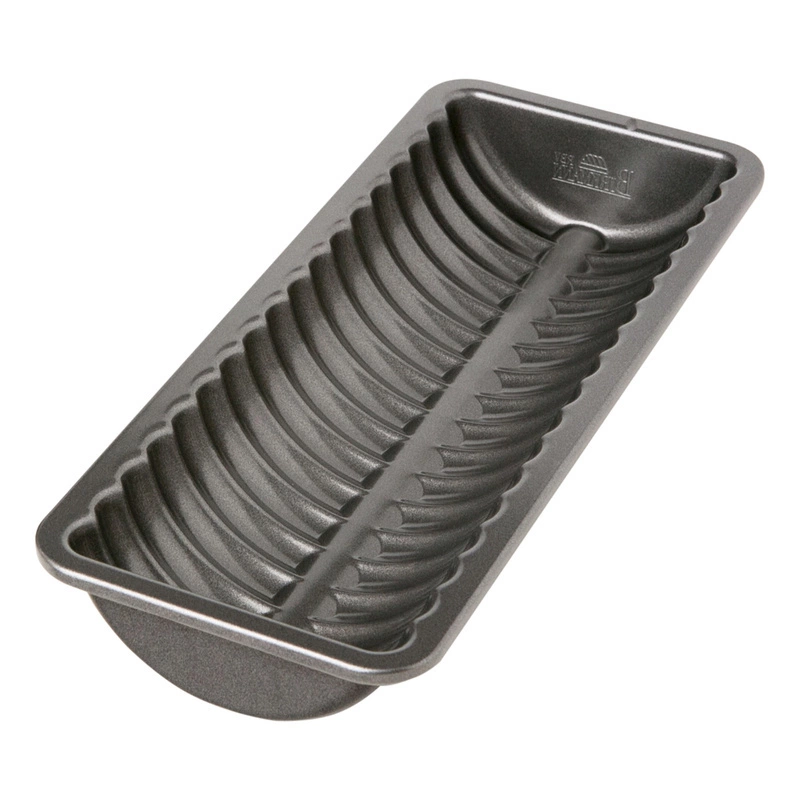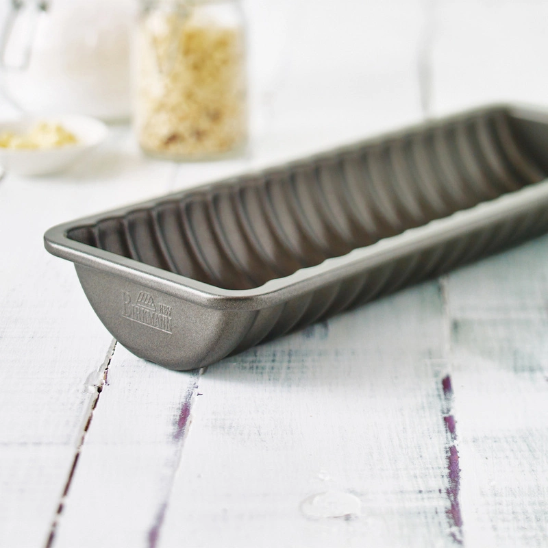Półokrągła keksówka ( dł 30 cm) z karbowanym brzegiem wykonana ze stali węglowej z powłoką nieprzywierającą. Wywinięte, szerokie brzegi zapewniają trwałość. Wytrzymałość temperaturowa do 230°C. Myć ręcznie. W opakowaniu przepis na ciasto.
