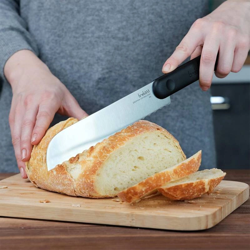 Nóż do chleba przeznaczony do krojenia pieczywa i ciast. Posiada długie ostrze 20 cm wykonane z wysokiej jakości japońskiej stali nierdzewnej. Profesjonalne ostrze w kształcie litery V zachowuje długo ostrość. Antypoślizgowa rękojeść wykonana z tworzywa ABS/TPR zapewnia wygodny i bezpieczny chwyt. Myć ręcznie.