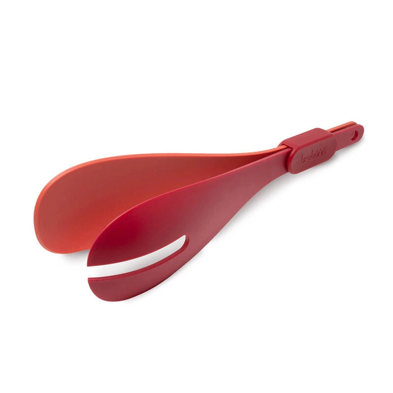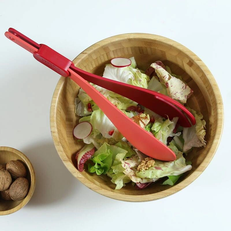Sztućce do serwowania sałaty składające się z designerskiej łyżki i widelca, które można używać osobno do mieszania lub razem do serwowania. Wykonane z trwałego nylonu odpornego na temperaturę do 200°C.;Dzięki klipsowi można je łatwo zmienić ze sztućców do sałatek w szczypce do serwowania. Można myć w zmywarce.