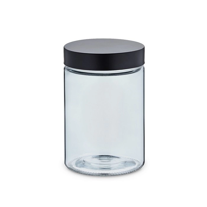 Szklany pojemnik kuchenny ze stalową pokrywką.