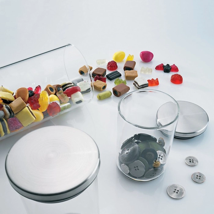- szklany pojemnik został uzupełniony o szczelnie przylegającą, stalową pokrywkę