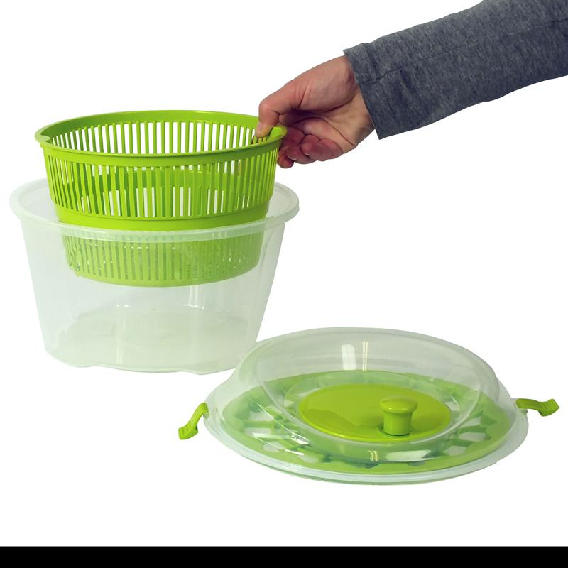 - sałatę umieścić w sitku i kręcić korbką, woda pozostanie w pojemniku