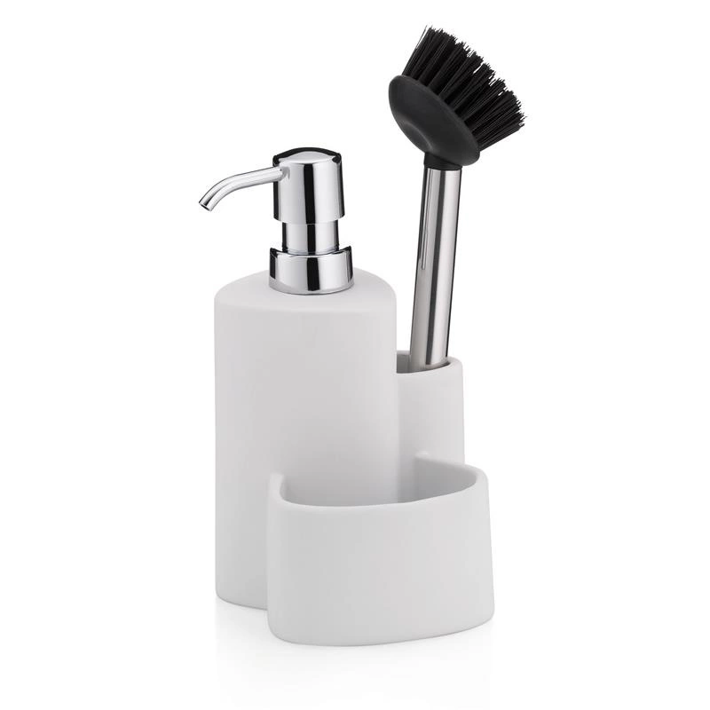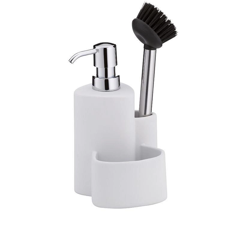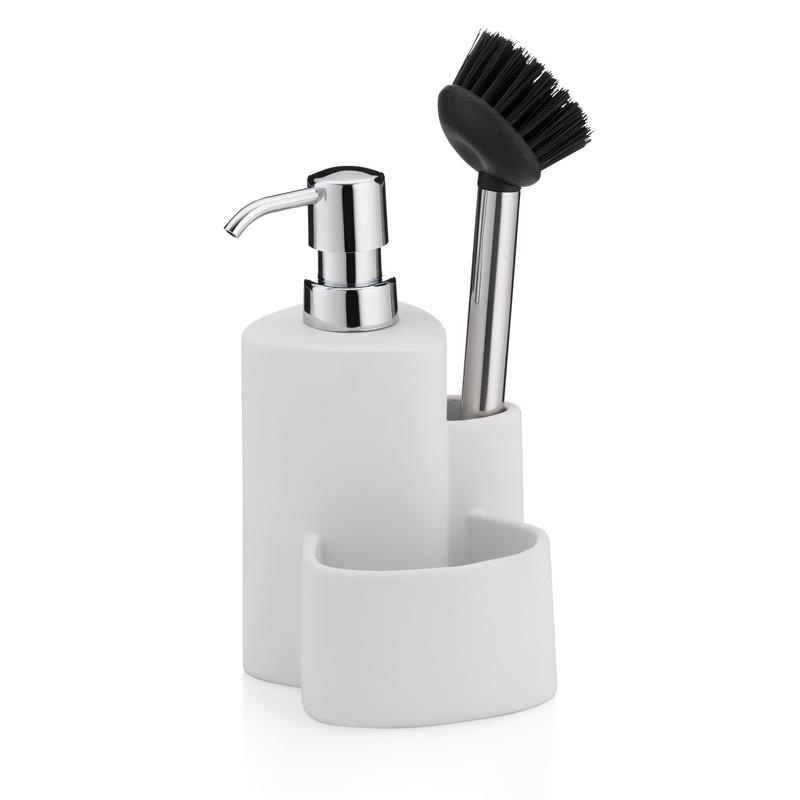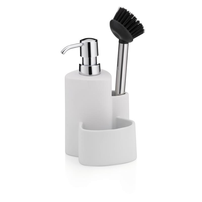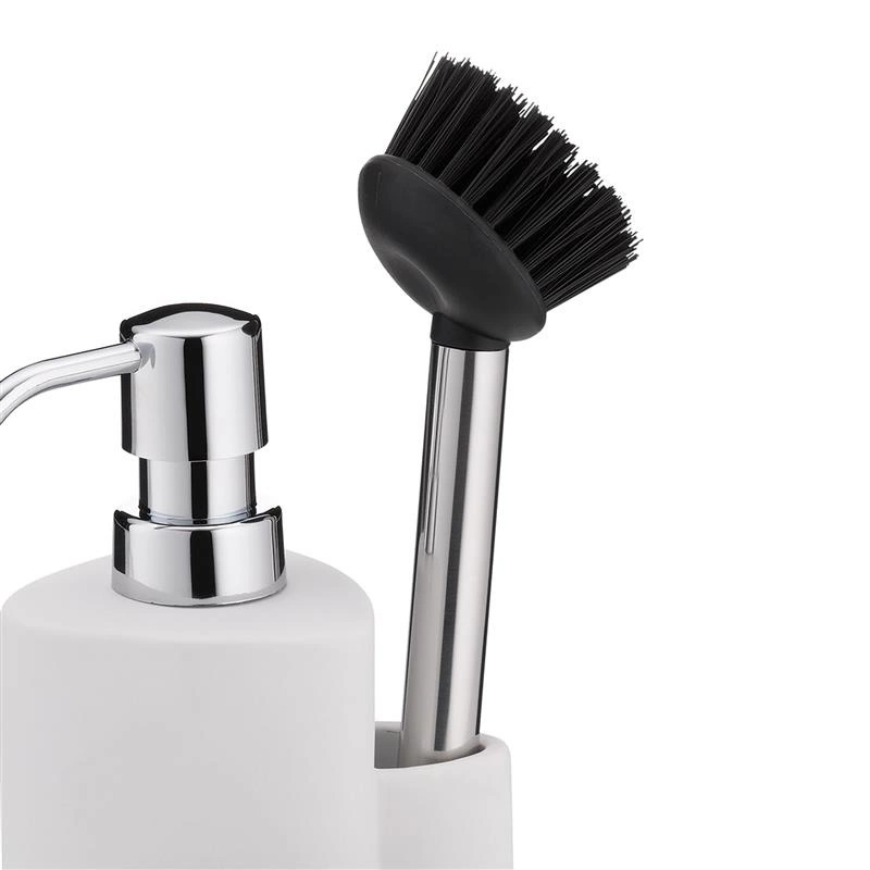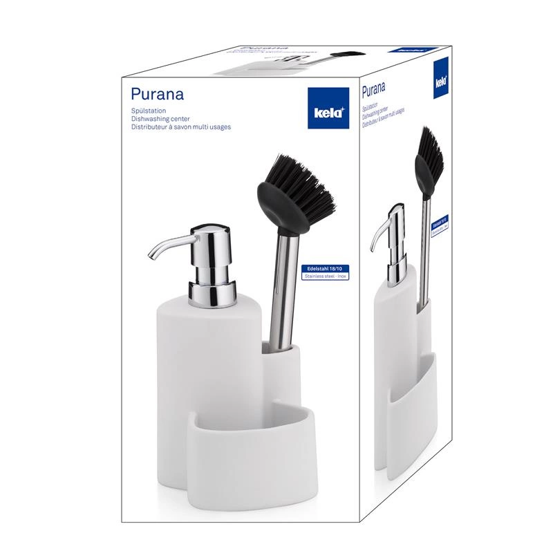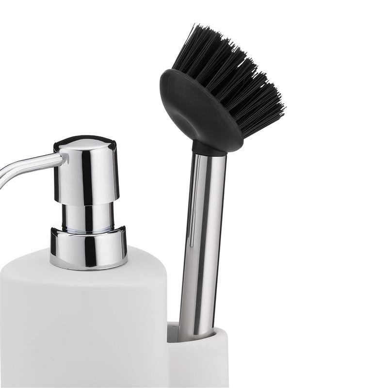 Kela - ceramiczny dozownik do mydła ze szczotką do naczyń, 10x11, wys.22 cm, 350 ml, biały Purana