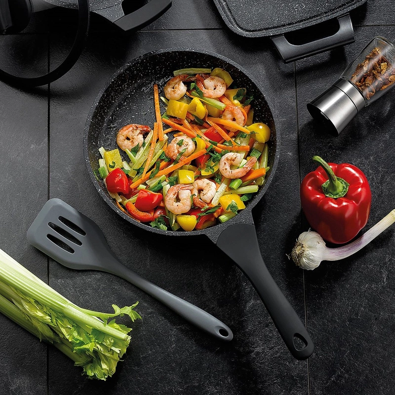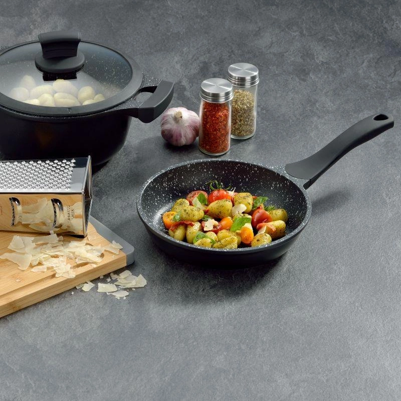 - powłoka nieprzywierająca pozwala na smażenie delikatnych potraw, takich jak omlety czy ryby, a chropowata powierzchnia nada jedzeniu chrupkości