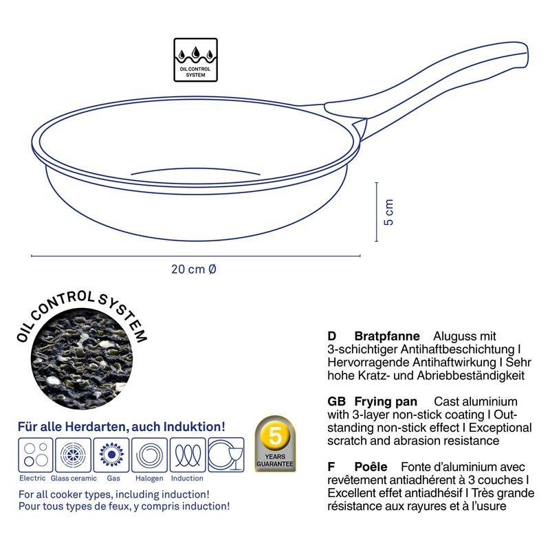 - patelnia pokryta jest chropowatą powłoką nieprzywierającą, która zapewnia optymalne i równomierne rozprowadzenie tłuszczu na całej powierzchni - olej nie spływa do krawędzi, co umożliwia zdrowe i dokładne smażenie na bardzo małej ilości tłuszczu