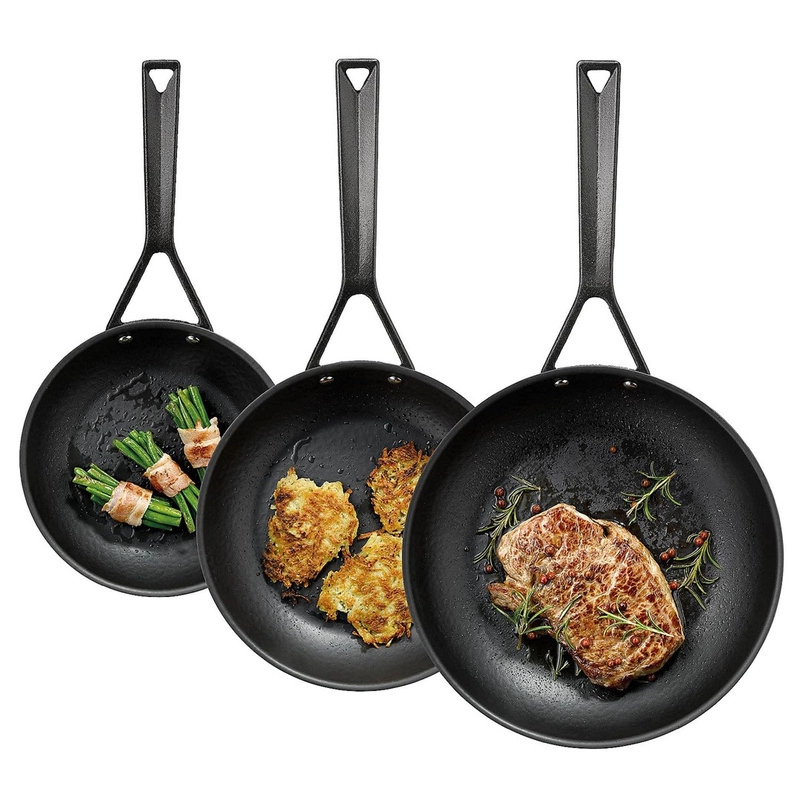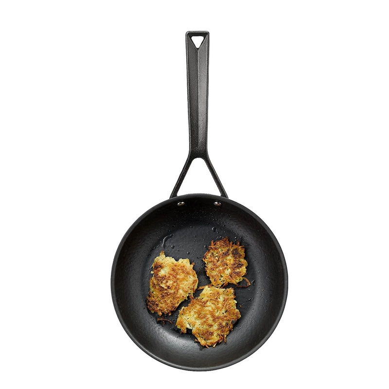 - żelazna patelnia niewymagająca sezonowania (przed pierwszym użyciem należy tylko zmyć woskową powłokę zapobiegającą rdzewieniu)