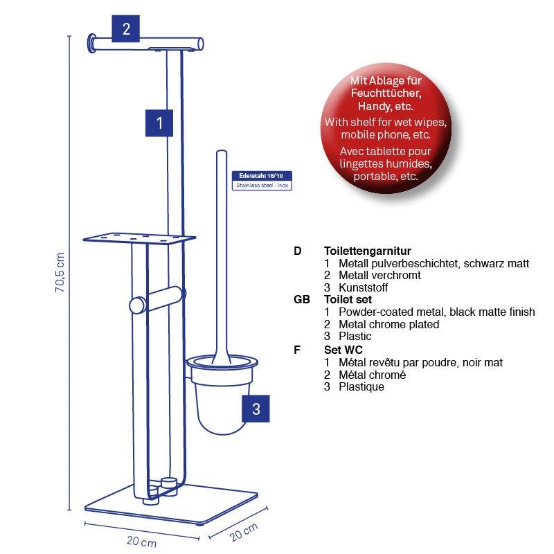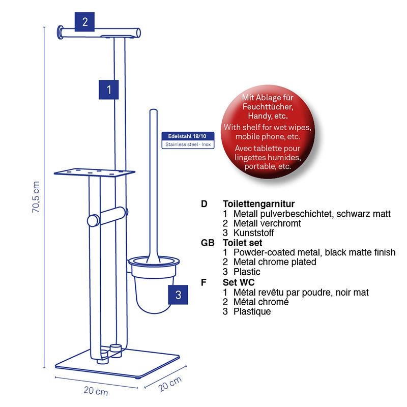 - szczotka do WC, uchwyt na papier toaletowy i dodatkowa półka na jednym stojaku