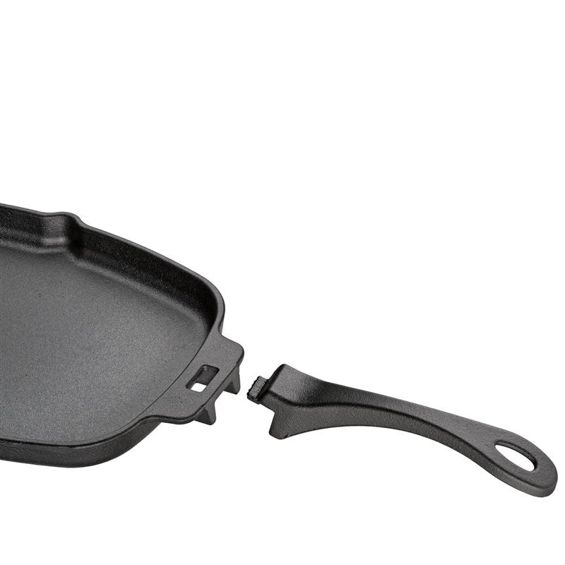 - uchwyt patelni może zostać odłączony, dzięki czemu patelnię łatwiej zmieścić w piekarniku czy pod pokrywą grilla, zapobiega to także nagrzewaniu się uchwytu