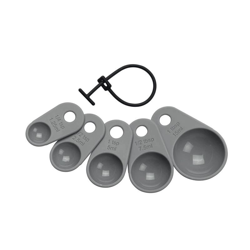 Zestaw pięciu miarek z silikonu platynowego do odmierzania składników i przypraw do pieczenia i gotowania.