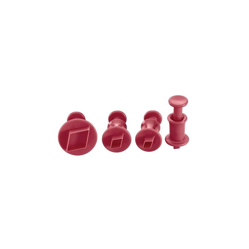 Cztery formy do wykrawania rombów z lukru w czterech rozmiarach. Praktyczne tłoki pozwalają na wysuwanie gotowych dekoracji bez ryzyka ich zgniecenia lub uszkodzenia.