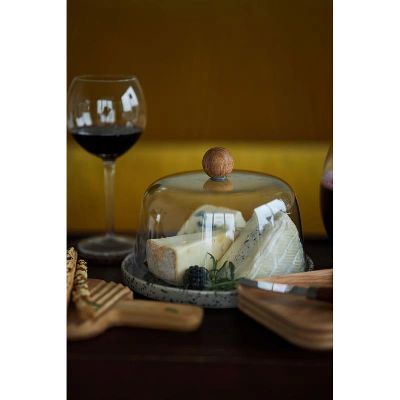 Talerz do podawania sera wyposażony w akrylowy klosz o dębowym uchwycie.