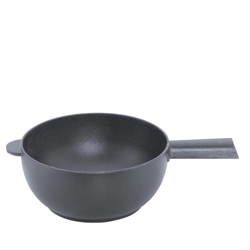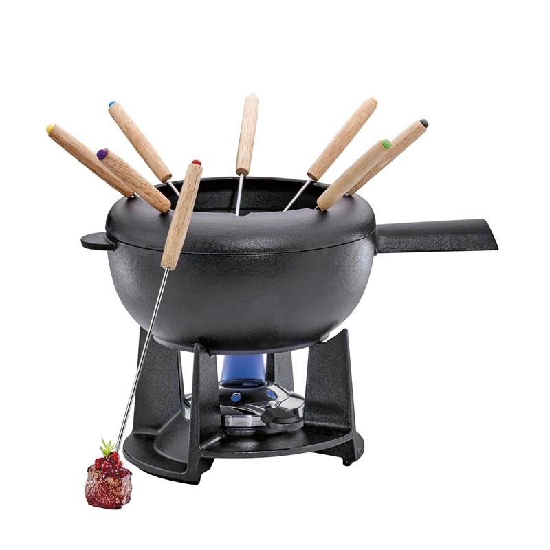 - zestaw z żeliwnym garnkiem do fondue serowego sprawdzi się także do fondue mięsnego