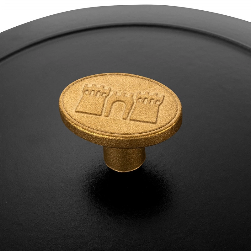 Okrągły garnek ma szczególnie odporną na zarysowania powłokę emaliowaną i nadaje się do mycia w zmywarce, a także do piekarnika do 240°C. Projekt pochodzi od mediolańskich projektantów Matteo Thun & Antonio Rodriguez i w połączeniu matową złotą gałką z logo BALLARINI sprawia, że przyciąga wzrok podczas serwowania.