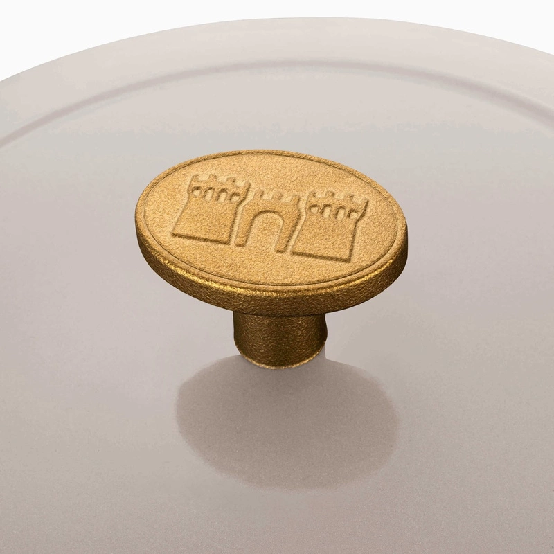 Okrągły garnek ma szczególnie odporną na zarysowania powłokę emaliowaną i nadaje się do mycia w zmywarce, a także do piekarnika do 240°C. Projekt pochodzi od mediolańskich projektantów Matteo Thun & Antonio Rodriguez i w połączeniu matową złotą gałką z logo BALLARINI sprawia, że przyciąga wzrok podczas serwowania.