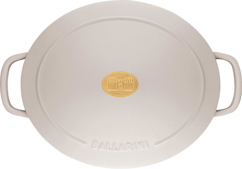 Garnek owalny ma szczególnie odporną na zarysowania powłokę emaliowaną i nadaje się do mycia w zmywarce, a także do piekarnika do 240°C. Projekt pochodzi od mediolańskich projektantów Matteo Thun & Antonio Rodriguez i w połączeniu matową złotą gałką z logo BALLARINI sprawia, że przyciąga wzrok podczas serwowania.