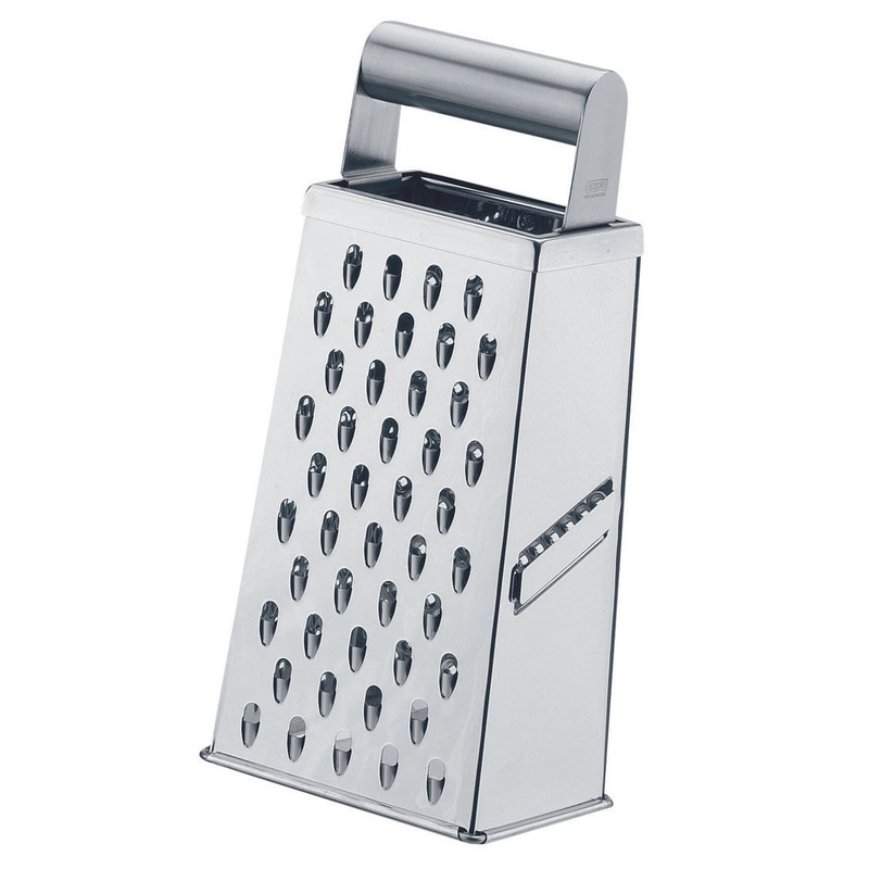 Czterostronna tarka z dwustronnymi ostrzami umożliwia perfekcyjne ścieranie w obu kierunkach. Wygodna w użytkowaniu dzięki stabilnemu, ergonomicznemu uchwytowi. Możesz jej używać do tarcia drobnego, grubego czy na plasterki. Bardzo łatwa w utrzymaniu w czystości, możesz myć ją w zmywarce. Wykonana w 100% ze stali nierdzewnej.