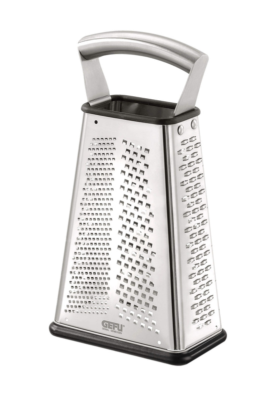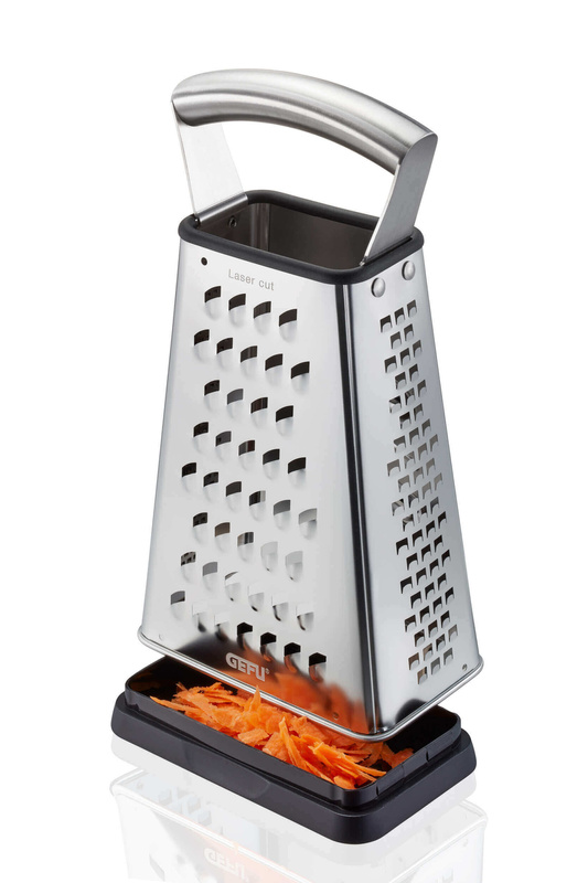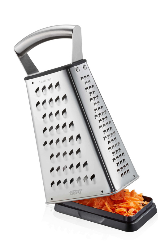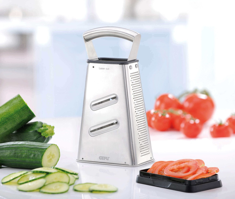Czterostronna tarka ze stali nierdzewnej VITALES Ostre cięcie! Technologia cięcia laserowego zapewnia ostre jak brzytwa krawędzie tnące i doskonałe rezultaty ścierania przez długi czas. Dzięki czterem różnym wzorom tarcia poradzi sobie ze wszystkimi warzywami, a także serem, czekoladą, imbirem czy gałką muszkatołową. Tarka VITALES gwarantuje wygodę w użytkowaniu, ponieważ posiada antypoślizgową podstawę i stabilny, ergonomiczny uchwyt wykonany ze stali nierdzewnej. Ponadto posiada pojemnik do zbierania ścieranych przez Ciebie składników.
