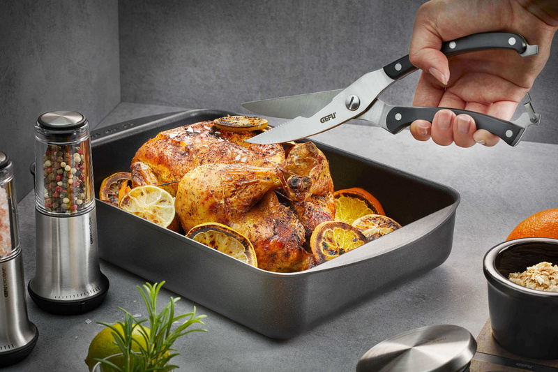Profesjonalne nożyce do drobiu VIGO umożliwiają krojenie i porcjowanie każdego rodzaju drobiu. Wyjątkowo ostre ostrze pozwoli bez problemu podzielić mięso zarówno upieczone jak i przed obróbką cieplną. Doskonale wyprofilowane uchwyty gwarantują wygodny i pewny chwyt. Nożyce wyposażone są w innowacyjny mechanizm sprężynowy, dzięki czemu można je swobodnie przesuwać. Na czas przechowywania zabezpiecz nożyce z pomocą wbudowanego mechanizmu blokującego.