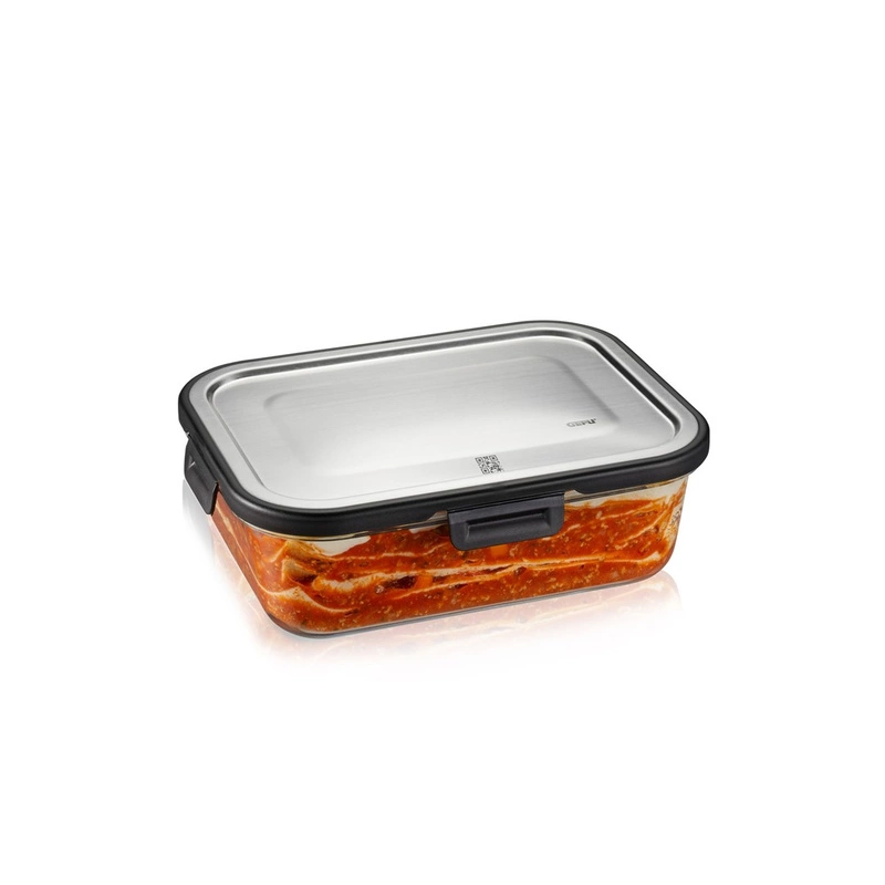 - pojemnik z wysokiej jakości szkła borokrzemowego z pokrywką ze stali nierdzewnej
