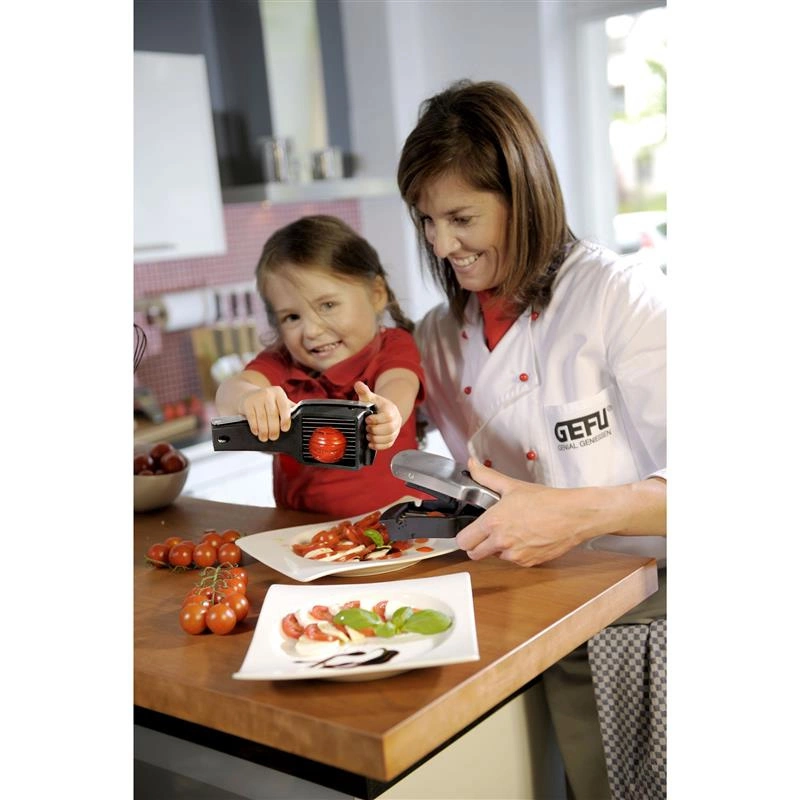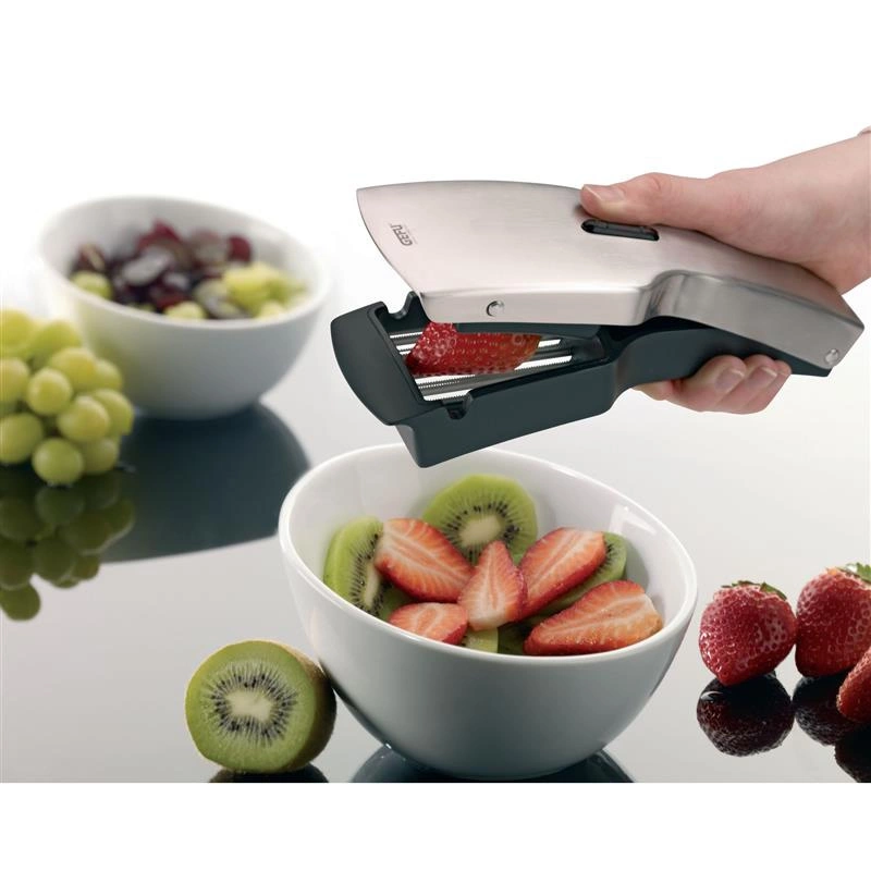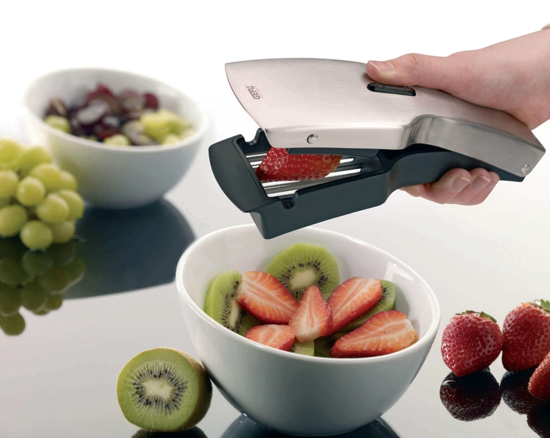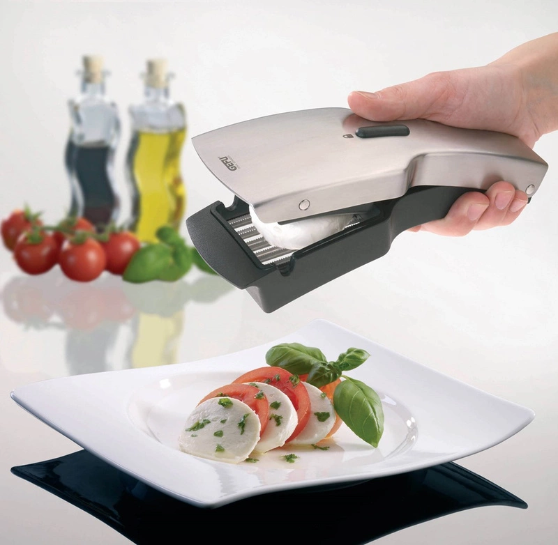 Nie musisz już dłużej męczyć się z ręcznym krojeniem składników, aby uzyskać idealnie równe plastry o grubości 5 mm do swoich dań. Ta profesjonalna krajalnica posiada specjalistyczne, ząbkowane, japońskie ostrze, które sprawia, że krojenie jest niezwykle łatwe i precyzyjne. Niezależnie od tego, czy przygotowujesz sałatkę owocową, pomidory z mozzarellą, czy pyszne danie z grzybów, ta krajalnica z pewnością ułatwi Ci pracę. A po użyciu możesz ją bez problemu włożyć do zmywarki.