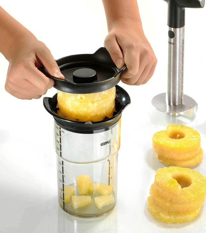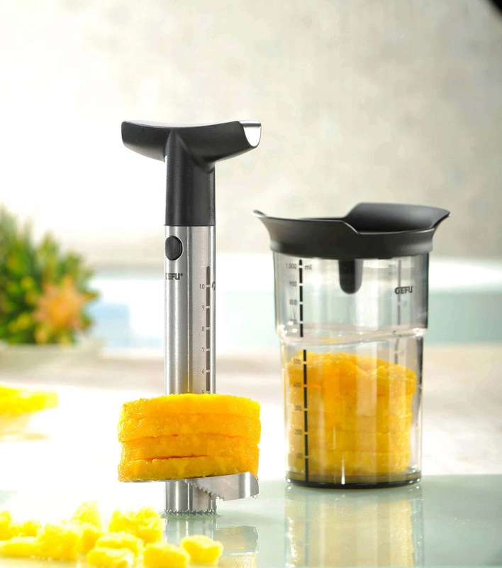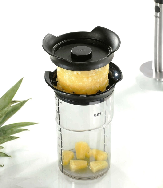 Gdy raz spróbujesz świeżego ananasa, już nigdy nie będziesz chciał się bez niego obejść: soczysty, słodki i po prostu pełen smaku. Jedzenie tego owocu z całą pewnością sprawia przyjemność, czego niestety nie można powiedzieć o jego przygotowywaniu. Dzięki odpowiedniemu narzędziu krojenie ananasa staje się dziecinnie proste. Z wykrawaczem PROFESSIONAL w mgnieniu oka przygotujesz apetyczne kawałki ananasa. Dodatkowo dzięki nadrukowanej skali z liczbą plasterków, zawsze przygotujesz idealną porcję. W zestawie dodatkowa krajalnica do małych kawałków (12 częściowa) i pojemnik do przechowywania (1000 ml).