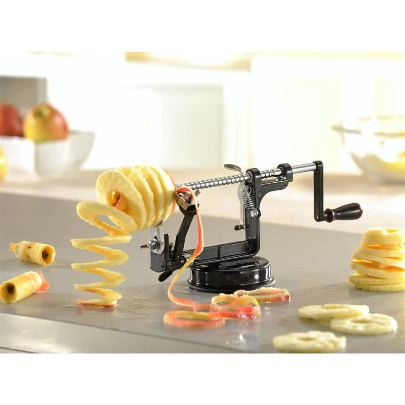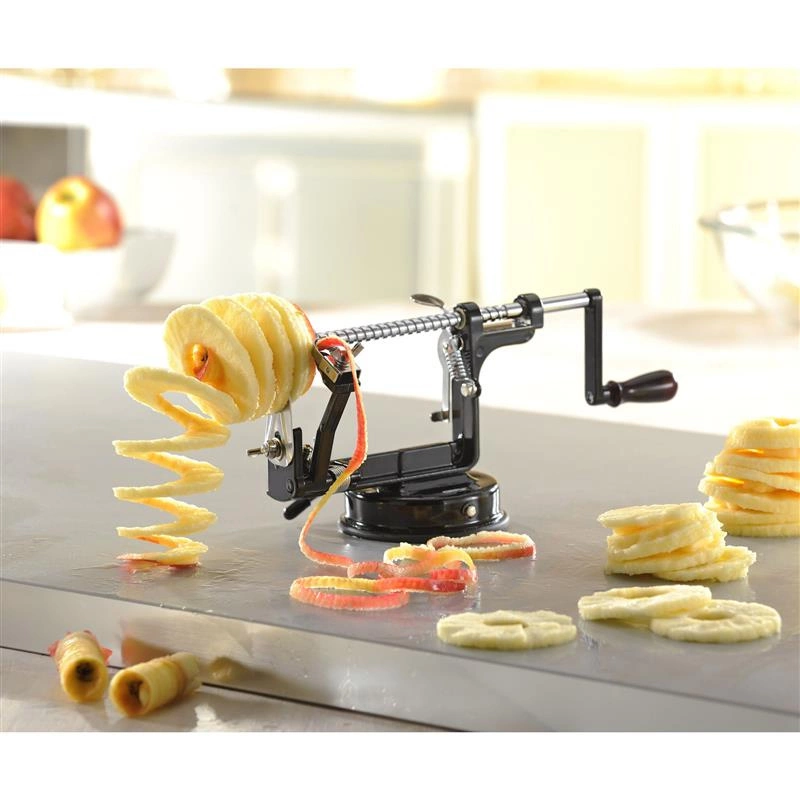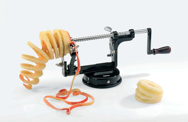 Obieranie jabłek jeszcze nigdy nie było tak proste! Dzięki urządzeniu DELICIO w mgnieniu oka przygotujesz owoce na przetwory czy do wypieków. Obieraczka DELICIO 3 w 1 nie tylko obierzesz jabłka, ale także pozbędziesz się z nich pestek i pokroisz je w spirale. Wystarczy, że zamocujesz owoc, przekręcisz korbkę i gotowe! Przyssawka pozwala na stabilne utrzymanie obieraczki na dowolnej płaskiej powierzchni.
