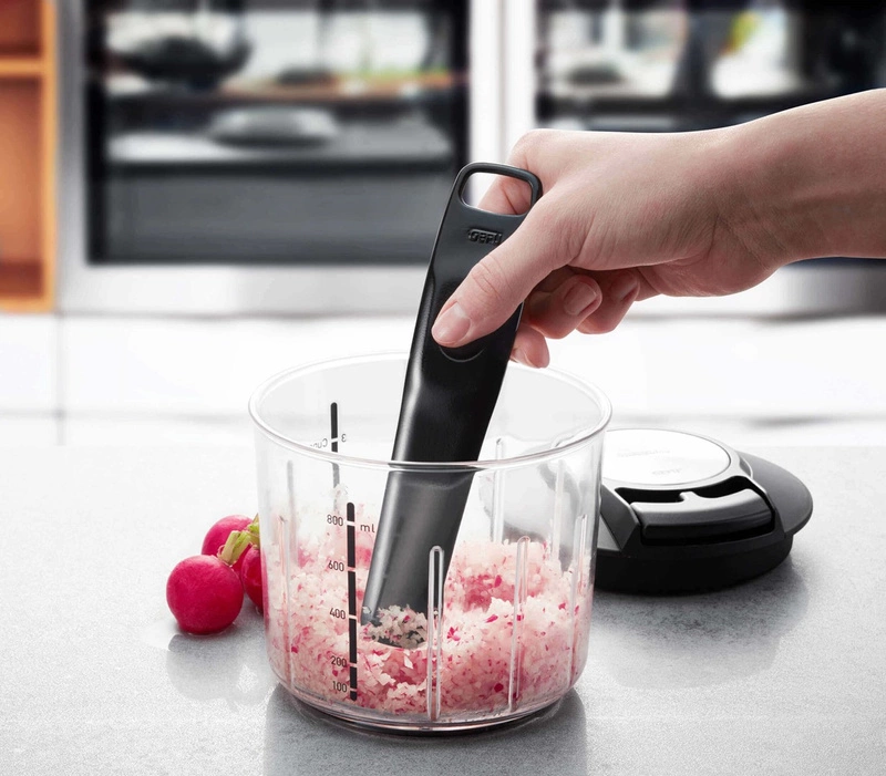 Wydajny i oszczędzający czas przyrząd kuchenny. Kruszenie, ucieranie, miksowanie, ubijanie i mieszanie nim różnych składników jest dziecinnie proste. Rozdrabniacz o niezwykle szerokim zakresie zastosowań. Nie tylko sieka owoce, warzywa, orzechy czy cebulę, ale może być również używany do mieszania i miksowania dipów, przygotowywania deserów oraz suszenia ziół. Dwa bardzo ostre, zakrzywione ostrza zapewniają optymalne cięcie. Wymienna wkładka pozwala na tworzenie kremowych past do smarowania i sosów sałatkowych. Rowki w pojemniku powodują, że krojone produkty są prowadzone w dół. Szatkownica posiada miarkę, która umożliwia odmierzanie składników. W komplecie dostaniesz także nakładki ochronne na ostrza i pokrywkę do przechowywania.