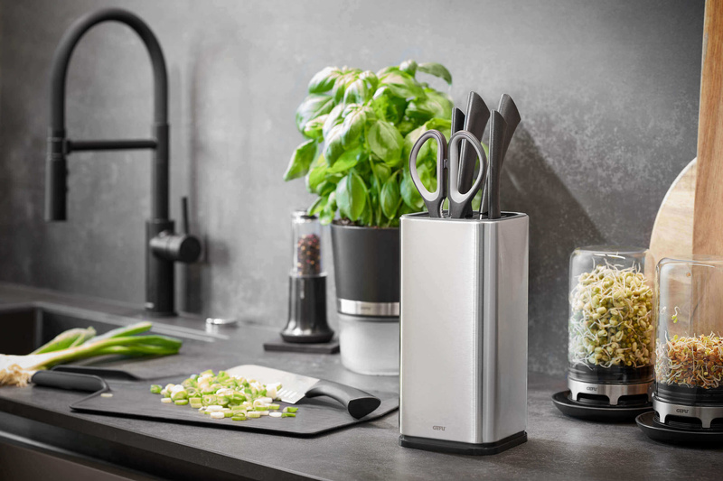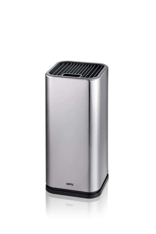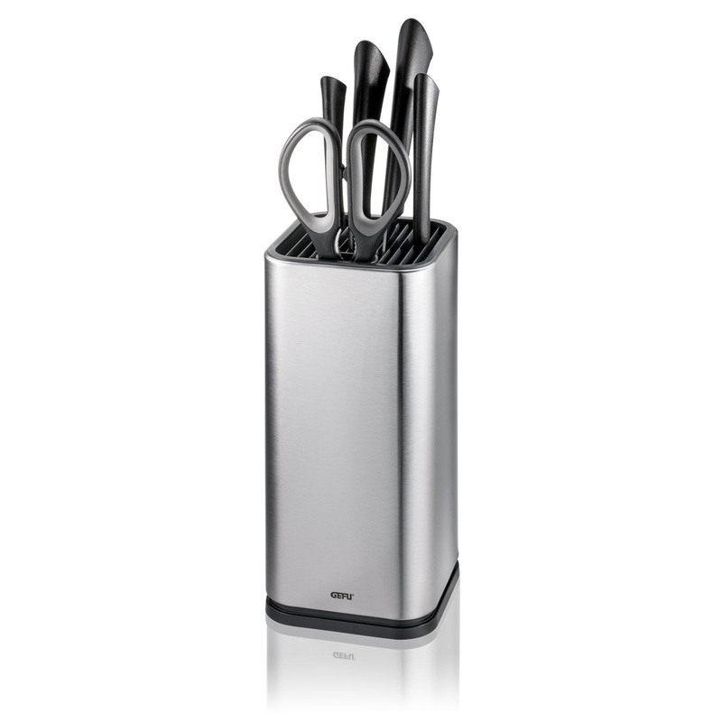 Elegancki sposób na trzymanie noży w zasięgu ręki. Wysokiej jakości blok na noże INSIEM to sposób na bezpieczne przechowywanie wszystkich ostrych narzędzi kuchennych. Ten stojak posiada aż 14 miejsc na noże o różnych rozmiarach oraz dodatkową szczelinę z przodu, idealną do przechowywania nożyczek kuchennych.