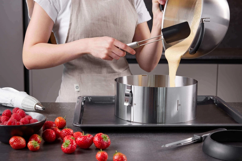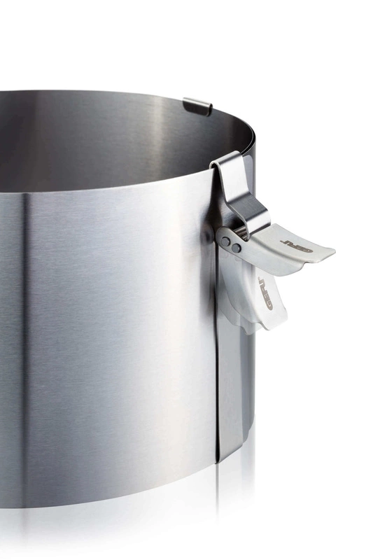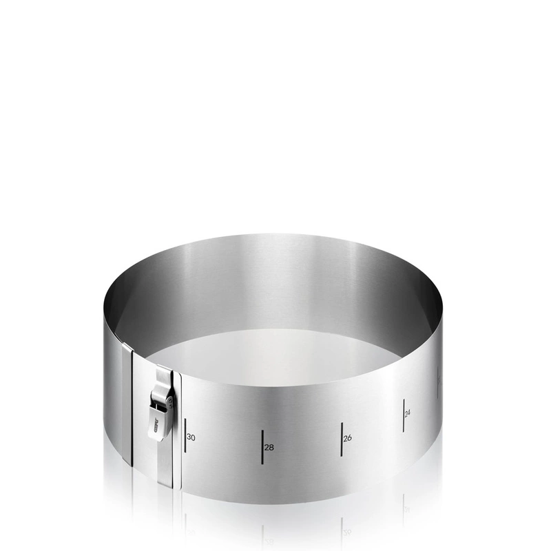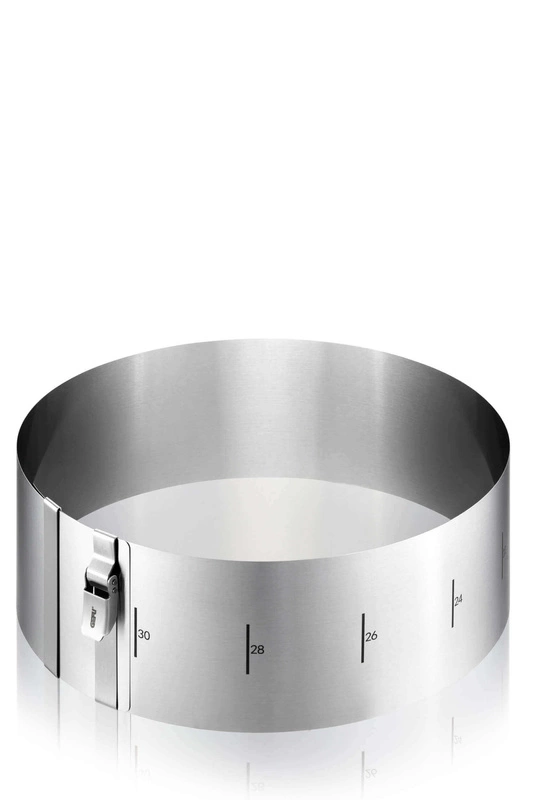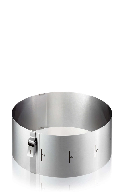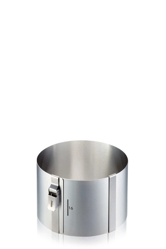 Obręcz do ciast wykonana ze stali nierdzewnej o wysokości 10 cm. Doskonale sprawdzi się przy robieniu tortów, zapiekanek warzywnych czy też mięsnych. Jej średnicę można regulować w zakresie od 16 cm do 30 cm, a klips zatrzymuje ją w wybranym rozmiarze. Łatwa w utrzymaniu w czystości dzięki możliwości całkowitego rozłożenia.
