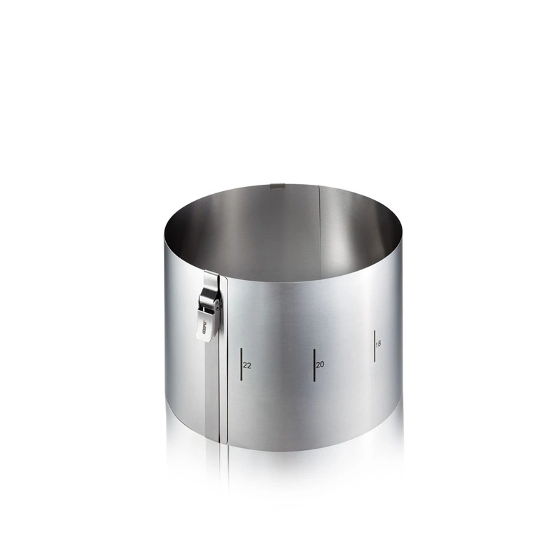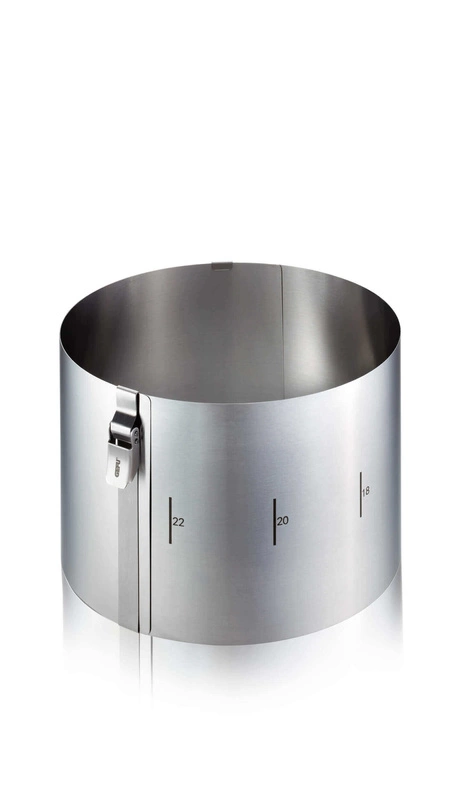 Obręcz do ciast wykonana ze stali nierdzewnej o wysokości 15 cm. Doskonale sprawdzi się przy robieniu tortów, zapiekanek warzywnych czy też mięsnych. Jej średnicę można regulować w zakresie od 16 cm do 30 cm, a klips zatrzymuje ją w wybranym rozmiarze. Łatwa w utrzymaniu w czystości dzięki możliwości całkowitego rozłożenia.