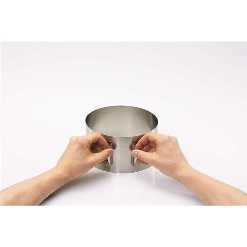 Obręcz do ciast wykonana ze stali nierdzewnej o wysokości 10 cm. Doskonale sprawdzi się przy robieniu tortów, zapiekanek warzywnych czy też mięsnych. Jej średnicę można regulować w zakresie od 16 cm do 32 cm. Łatwa w utrzymaniu w czystości dzięki możliwości całkowitego rozłożenia.