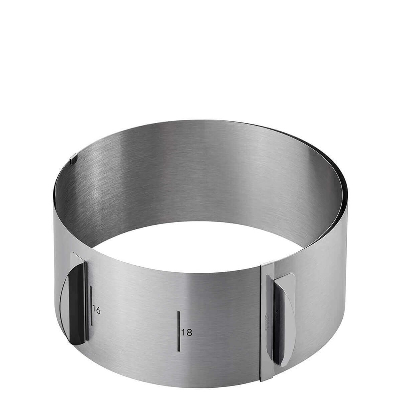 Obręcz do ciast wykonana ze stali nierdzewnej o wysokości 8,5 cm. Doskonale sprawdzi się przy robieniu tortów, zapiekanek warzywnych czy też mięsnych. Jej średnicę można regulować w zakresie od 16 cm do 32 cm. Łatwa w utrzymaniu w czystości dzięki możliwości całkowitego rozłożenia.