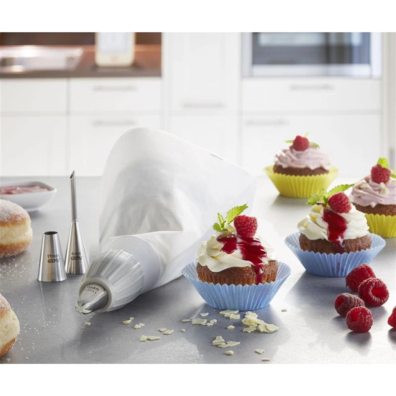 Dzięki temu rękawowi cukierniczemu z trzema końcówkami ze stali nierdzewnej, napełnianie foremek na muffiny, dekorowanie ciasta czy nadziewanie pączków stanie się dziecinnie łatwe. W zestawie znajdziesz bawełniany rękaw, plastikowy adapter do końcówek o różnej wielkości oraz 3 końcówki wykonane z najwyższej jakości stali nierdzewnej.