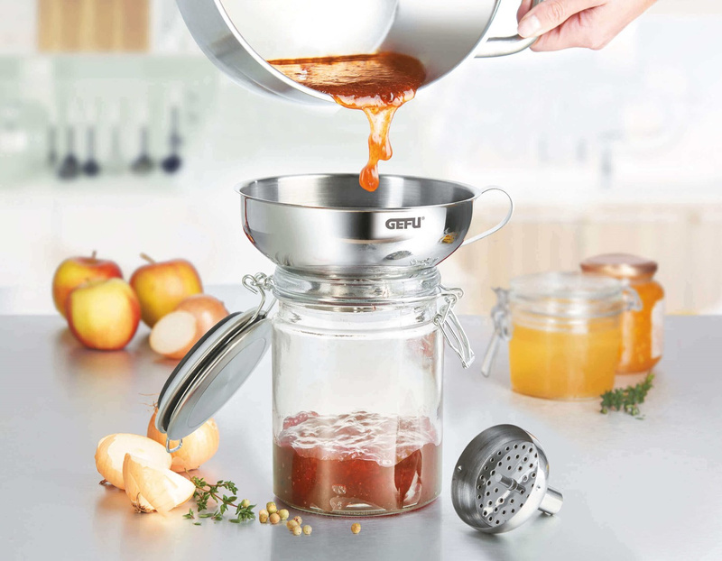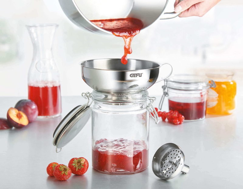 Praktyczny lejek VERSARE pomoże Ci rozlać domowy dżem do słoików. Dzięki wyjmowanemu sitku, do żadnego słoika nie dostaną się ani pestki, ani niechciany miąższ. Ten poręczny lejek, używany bez sitka, równie dobrze sprawdzi się przy napełnianiu młynka do pieprzu lub solniczki. Do stosowania z pojemnikami o średnicy od 1,5 do 5,5 cm.