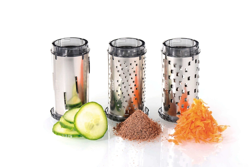 Niezwykle przydatny przyrząd w każdej kuchni. Koniec z mozolnym ścieraniem na tarce. Z pomocą obrotowej tarki RULLARE błyskawicznie zetrzesz ser, wszelkiego rodzaju warzywa, orzechy czy przyprawy. Możesz jej użyć również do szatkowania. Wszystko dzięki dwóm wymiennym ostrzom, każdy o innej grubości ścierania, oraz trzeciemu do szatkowania. Przyrząd wyposażony jest w zintegrowany z uchwytem popychacz.