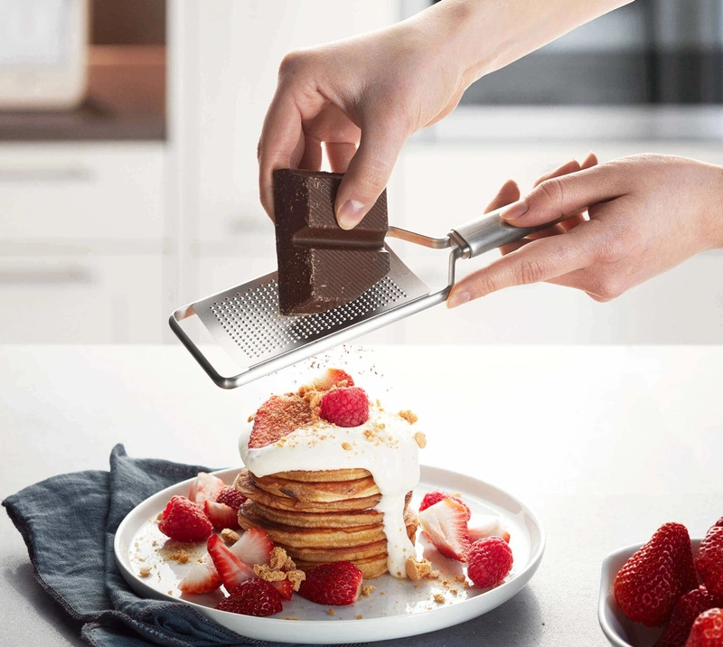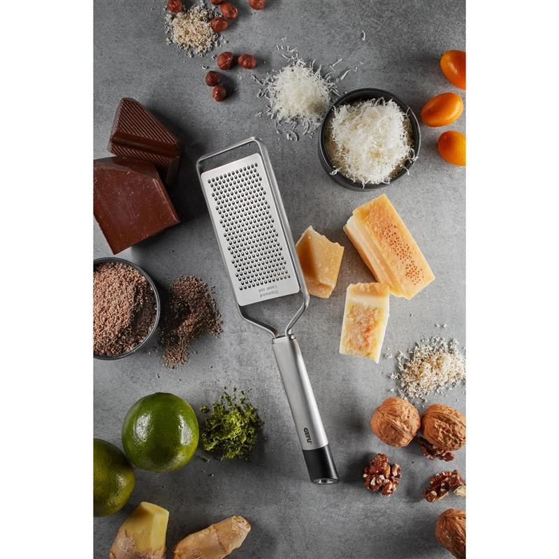 Mini tarka o drobnych oczkach PRIMELINE to niezastąpiony gadżet dla każdego, kto ceni sobie estetykę i smak swoich potraw. Dzięki precyzyjnym ostrzom, tarka bez trudu zetrze parmezan, czekoladę czy orzechy na drobne wiórki, które idealnie udekorują Twoje dania. Urządzenie jest niewielkie i poręczne, dzięki czemu możesz używać go bezpośrednio na stole, podczas serwowania posiłku. Tarka jest łatwa w czyszczeniu i posiada ergonomiczny uchwyt, co pozwala na wygodne i bezpieczne korzystanie z niej podczas pracy w kuchni. Każdy produkt z tej serii posiada specjalne oczko do zawieszenia, które wraz z dostępnymi haczykami (29251) umożliwia zawieszenie go na relingu kuchennym (29250).