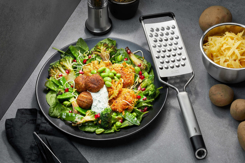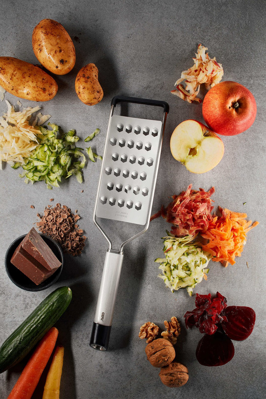 Używając tarki o grubych oczkach PRIMELINE, możesz w prosty sposób dodać do swoich sałatek i innych dań duże, efektowne wiórki warzywne. To jednak nie wszystko, ponieważ tarka ta świetnie sprawdzi się również ścierając ser, owocę czy czekoladę. Dzięki antypoślizgowej podstawie, tarka nie będzie się przesuwać podczas użytkowania, co zapewnia komfort i bezpieczeństwo pracy. Każdy produkt z tej serii posiada specjalne oczko do zawieszenia, które wraz z dostępnymi haczykami (29251) umożliwia zawieszenie go na relingu kuchennym (29250).