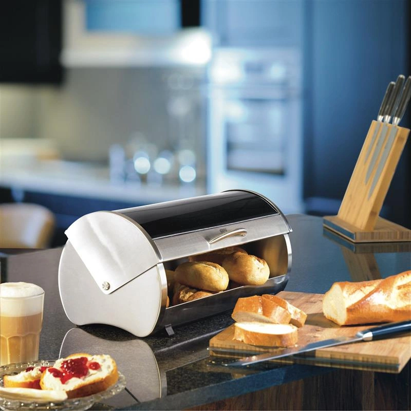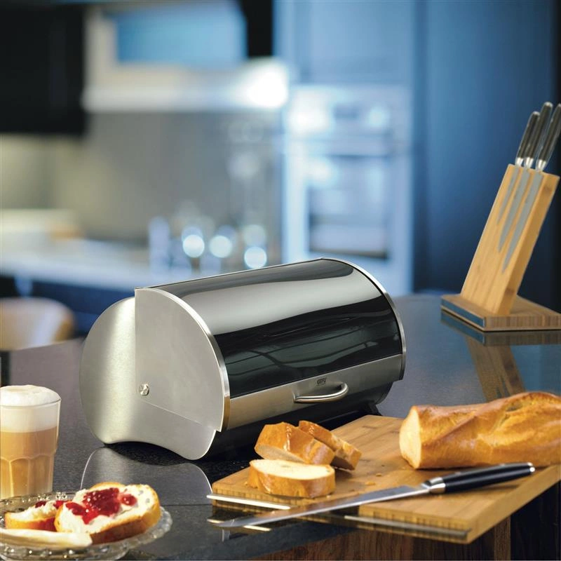 Chlebak RONDO to nie tylko elegancki element dekoracyjny Twojej kuchni, ale również funkcjonalne rozwiązanie, które pozwoli Ci zachować świeżość pieczywa na dłużej. Jego wygodny mechanizm i szerokie otwieranie umożliwiają przechowywanie pieczywa o różnych kształtach, a antypoślizgowa podstawa zapewnia stabilność. W przyciemnionym panelu szklanym, zabezpieczonym przed zarysowaniem, pieczywo pozostaje wilgotne i nie wysycha zbyt szybko. Szczeliny wentylacyjne między pokrywą a pojemnikiem zapewniają optymalną cyrkulację powietrza, co zapobiega powstawaniu pleśni. Dzięki temu, Twoje ulubione pieczywo będzie dłużej zachowywało swój smak i aromat.