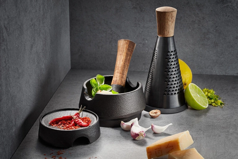 - PLOSION® składa się z czterech elementów. Solidnego moździerza z ciężkiego żeliwa. Masywnego tłuczka z drewnianym uchwytem z drzewa akacjowego. Pokrywy, która jednocześnie jest miejscem, gdzie zbierane mogą być starte produkty. Oraz tarki z dwoma rodzajami ostrzy. Całość stanowi piękną konstrukcję, która na pewno przyda się w każdej kuchni.