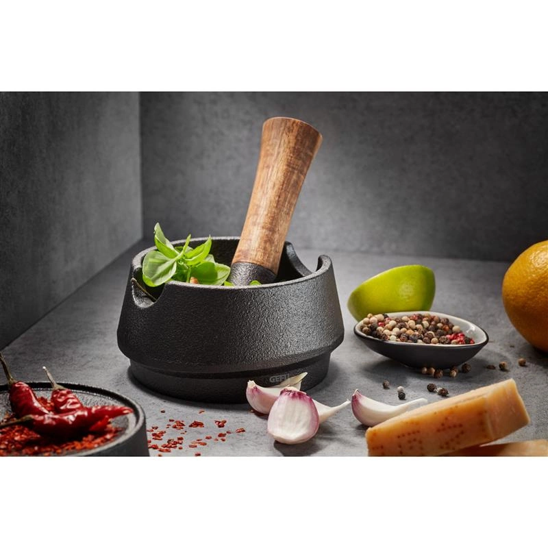 - żeliwny tłuczek z uchwytem wykonanym z drewna akacjowego