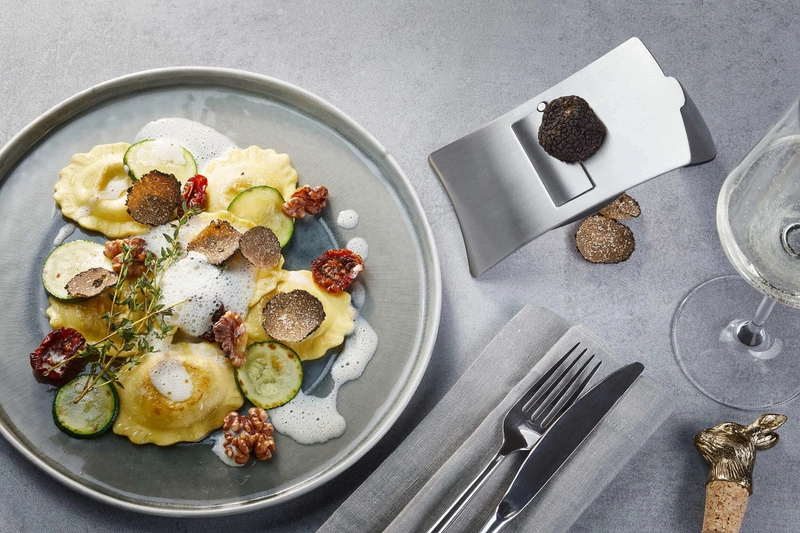 Dwustronna elegancka krajalnica TARTUFOLO. Na jednej z nich możesz pokroić ser, a na drugiej trufle, grzyby i parmezan. Produkt posiada wygodną antypoślizgową nóżkę, która utrzyma się na każdym kuchennym blacie.