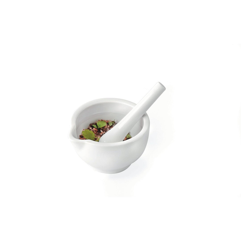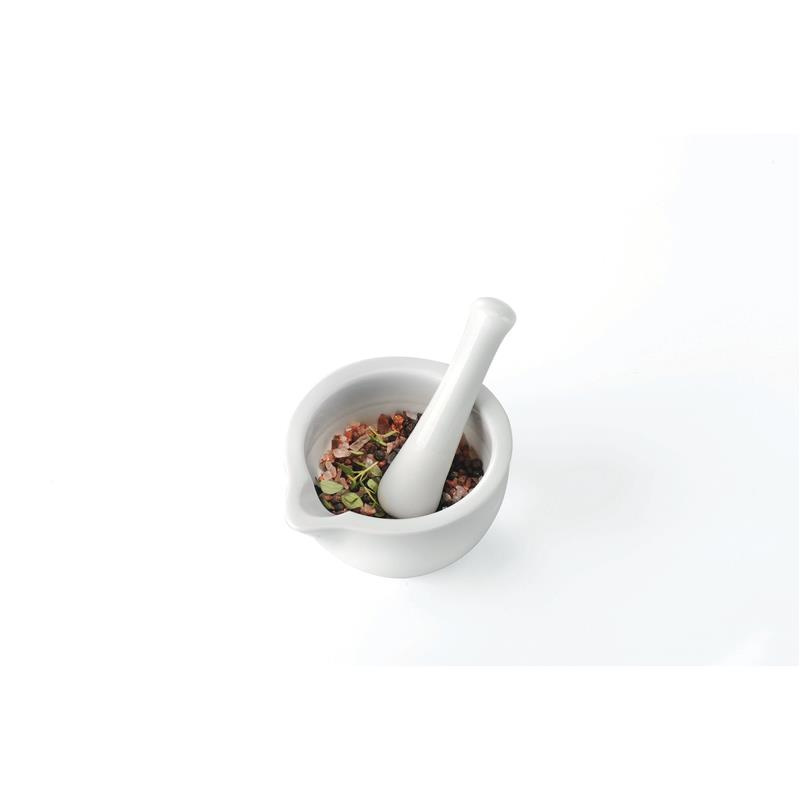 Porcelanowy moździerz MACINO to niezbędny element każdej kuchni. Dzięki ergonomicznemu tłuczku z łatwością rozgniecisz nawet najtwardsze ziarna pieprzu, a także świeże zioła. Wyprofilowane zakończenie pozwoli Ci na precyzyjne i czyste wysypywanie zmielonych przypraw wprost na przygotowaną potrawę lub do pojemnika. Moździerz wykonany jest z wysokiej jakości porcelany, co zapewnia trwałość i łatwe utrzymanie w czystości.