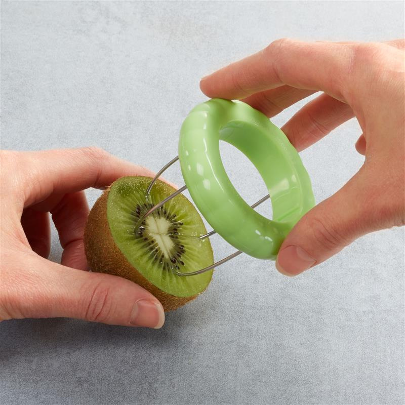 Zestaw TWISTA to niezbędne narzędzia dla miłośników kiwi. Nożyk do przecinania i wyjmowania gniazda z pestkami oraz przyrząd do wycinania owocu ze skórki umożliwiają szybkie i precyzyjne przygotowanie kiwi do jedzenia. Wszystkie elementy zestawu można łatwo złożyć w jedną całość, aby zaoszczędzić miejsce w szufladzie. Dzięki tym narzędziom, krojenie kiwi stanie się dziecinnie proste i przyjemne.