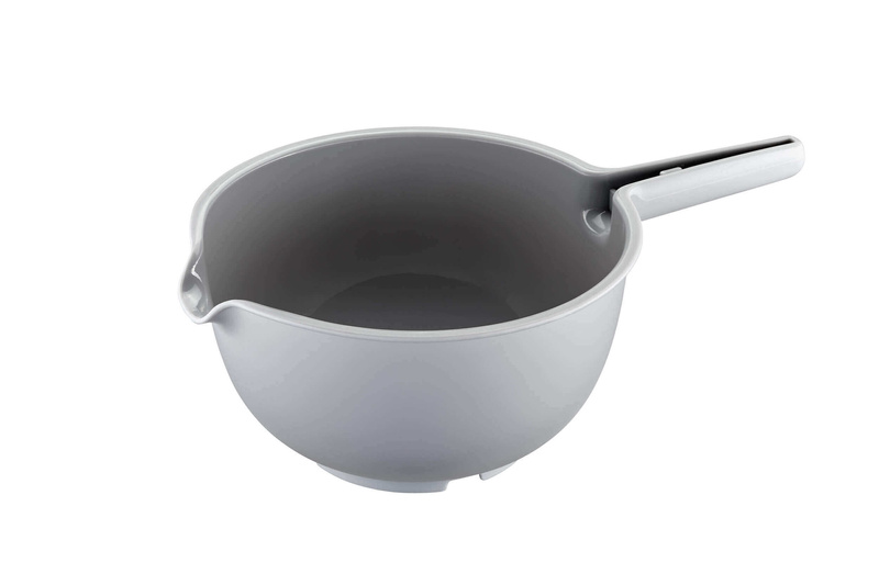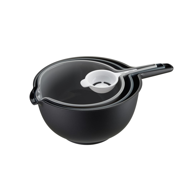 Zestaw PREPARO składa się z dwóch misek z tworzywa sztucznego o różnych rozmiarach, durszlaka oraz separatora do jajek. Wszystkie elementy posiadają długie, wygodne uchwyty oraz wylewkę. Zaletami tego zestawu są odporność na temperaturę do 100°C oraz możliwość włożenia jednego elementu w drugi, co ułatwi Ci przechowywanie. Zestaw składa się z: