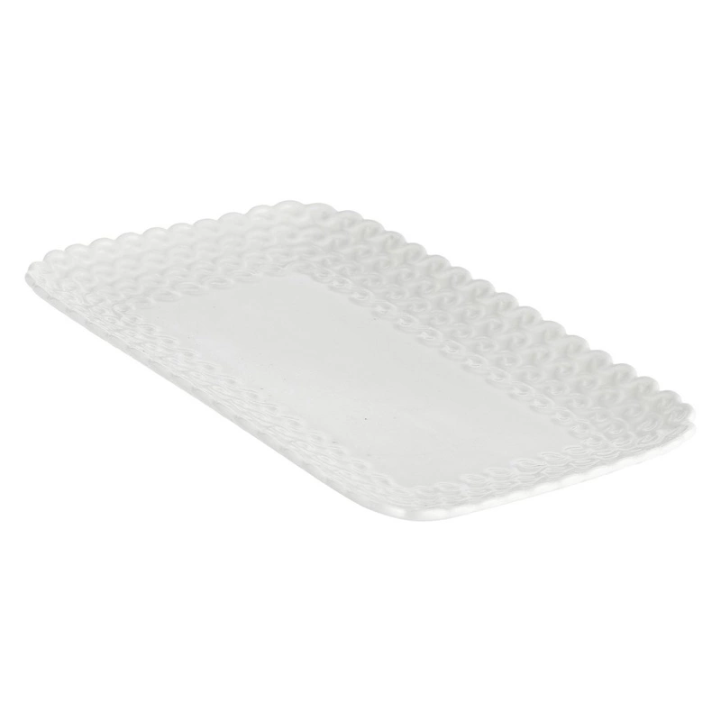 Taca do serwowania wykonana z białej porcelany o delikatnym wzorze efektownie prezentuje się w jadalni i wprost zachęca do spróbowania domowych wypieków. Sprawdzi się idealnie zarówno w codziennym użytkowaniu, jak i podczas rodzinnych uroczystości. Taca dostępna jest w rozmiarach: 20 x 13 cm, 27 x 19 cm, 31 x 22 cm oraz 35 x 26 cm.