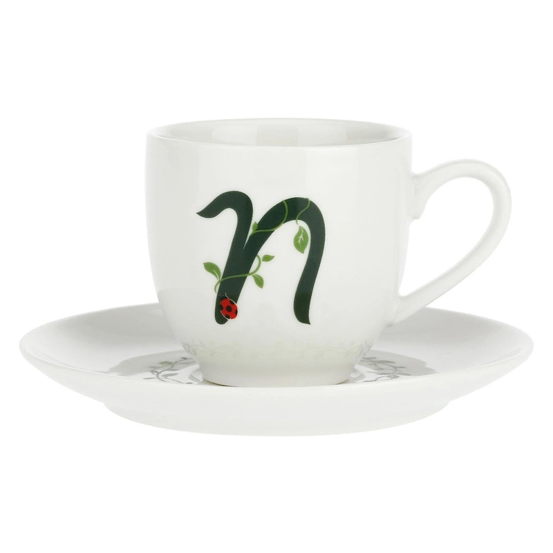 Kompletujesz swoją zastawę stołową i szukasz do niej niebagatelnych dodatków? Filiżanki do kawy i herbaty zdobione zielonymi literami alfabetu i roślinnym motywem ożywią każdy, nawet najprostszy serwis obiadowy! W zestawie z filiżanką otrzymasz także talerzyk z motywem liści bluszczu, który dopełni Twoją kolekcję!
