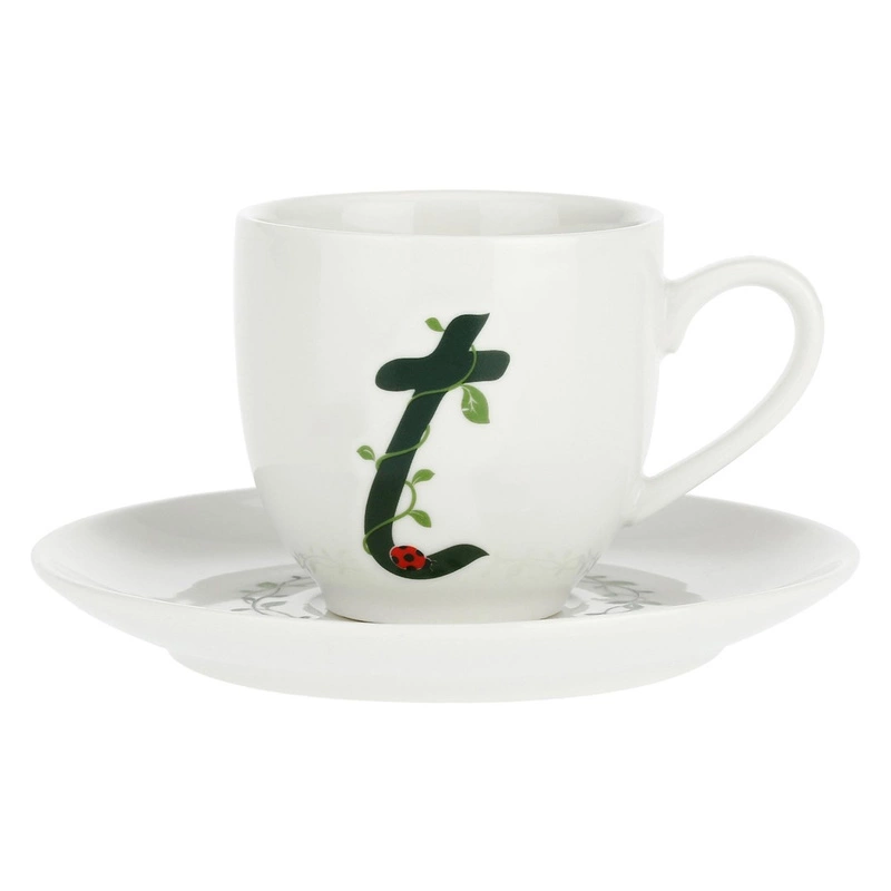 Kompletujesz swoją zastawę stołową i szukasz do niej niebagatelnych dodatków? Filiżanki do kawy i herbaty zdobione zielonymi literami alfabetu i roślinnym motywem ożywią każdy, nawet najprostszy serwis obiadowy! W zestawie z filiżanką otrzymasz także talerzyk z motywem liści bluszczu, który dopełni Twoją kolekcję!