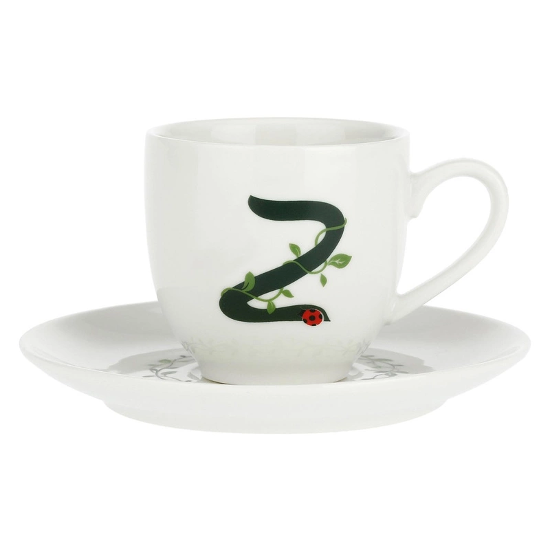 Kompletujesz swoją zastawę stołową i szukasz do niej niebagatelnych dodatków? Filiżanki do kawy i herbaty zdobione zielonymi literami alfabetu i roślinnym motywem ożywią każdy, nawet najprostszy serwis obiadowy! W zestawie z filiżanką otrzymasz także talerzyk z motywem liści bluszczu, który dopełni Twoją kolekcję!